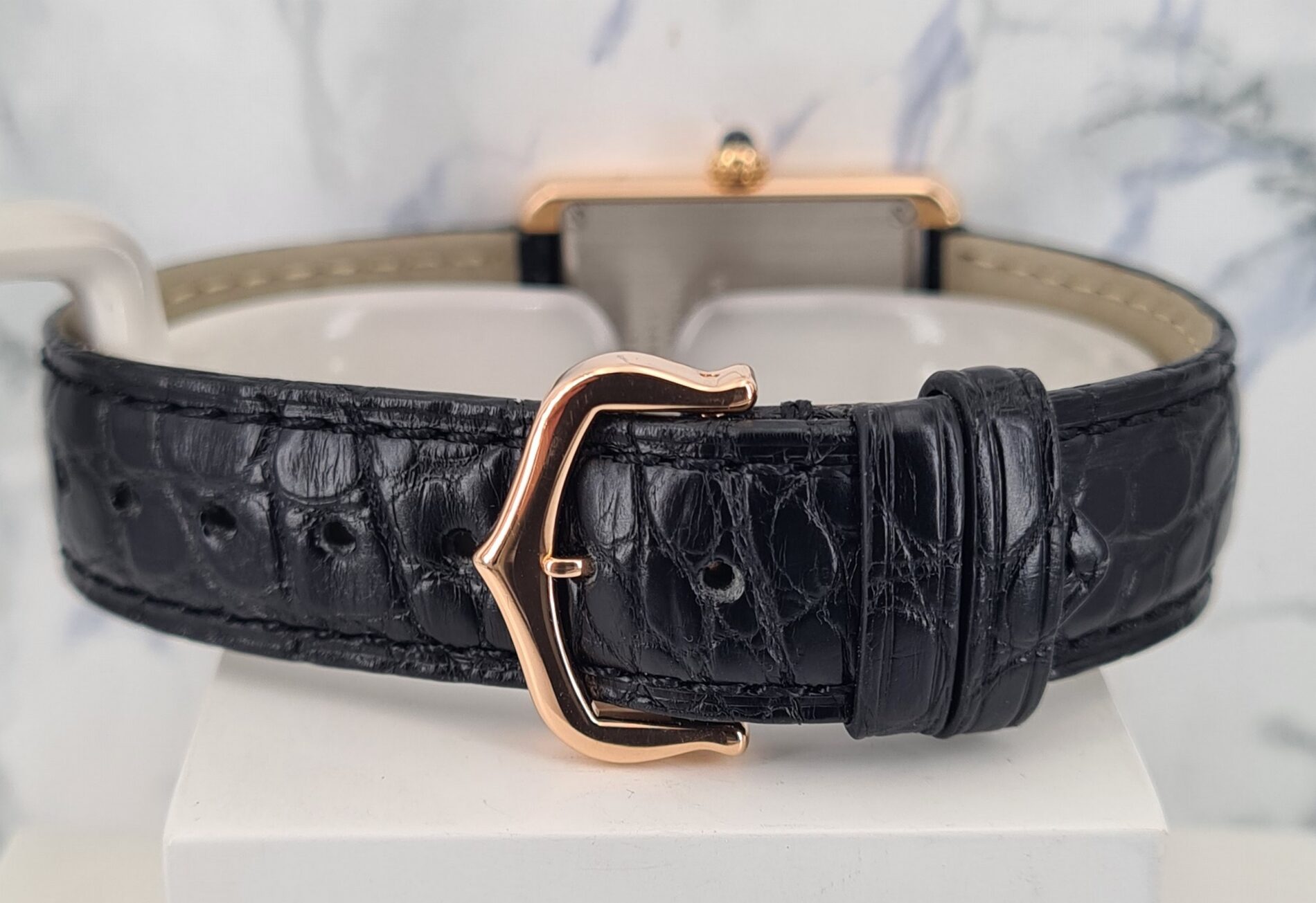 Avec ses attaches intégrées au boîtier, elle est tout à la fois un carré et un rectangle, coup de génie stylistique unique en son genre qui consiste à dissimuler les points d’attaches sous les célèbres brancards verticaux plats à arêtes vives de la montre Tank. La légende veut que Louis Cartier ait lui-même rapproché l’architecture de la montre Tank du dessin d’un char, vu de haut : les brancards pour les chenilles, le boîtier pour l’habitacle du véhicule.