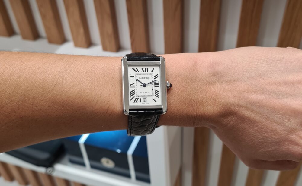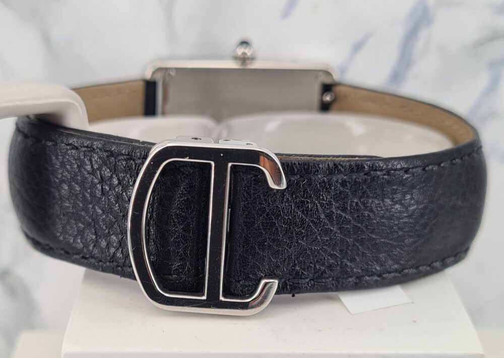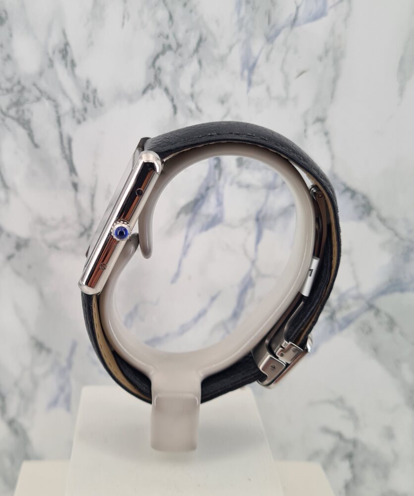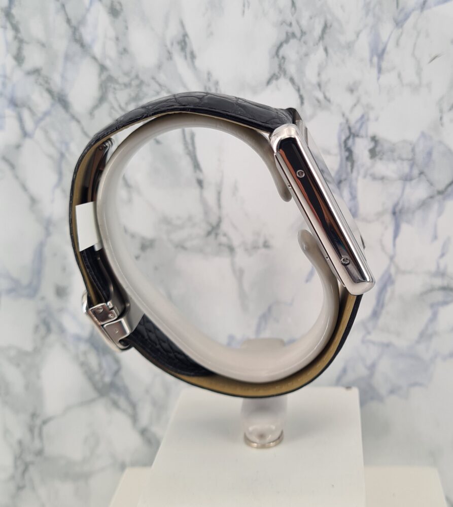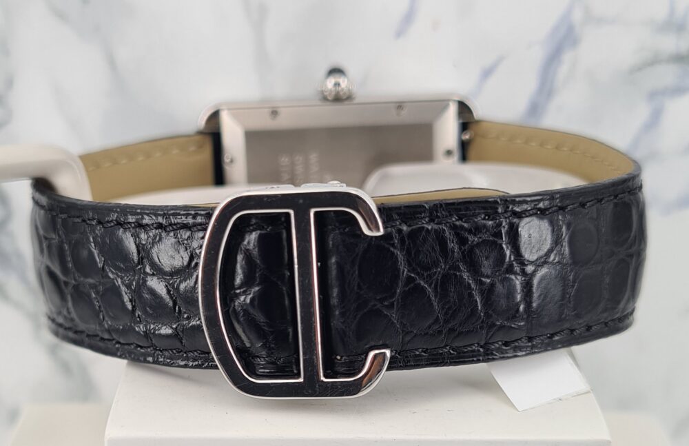 Avec ses attaches intégrées au boîtier, elle est tout à la fois un carré et un rectangle, coup de génie stylistique unique en son genre qui consiste à dissimuler les points d’attaches sous les célèbres brancards verticaux plats à arêtes vives de la montre Tank. La légende veut que Louis Cartier ait lui-même rapproché l’architecture de la montre Tank du dessin d’un char, vu de haut : les brancards pour les chenilles, le boîtier pour l’habitacle du véhicule.