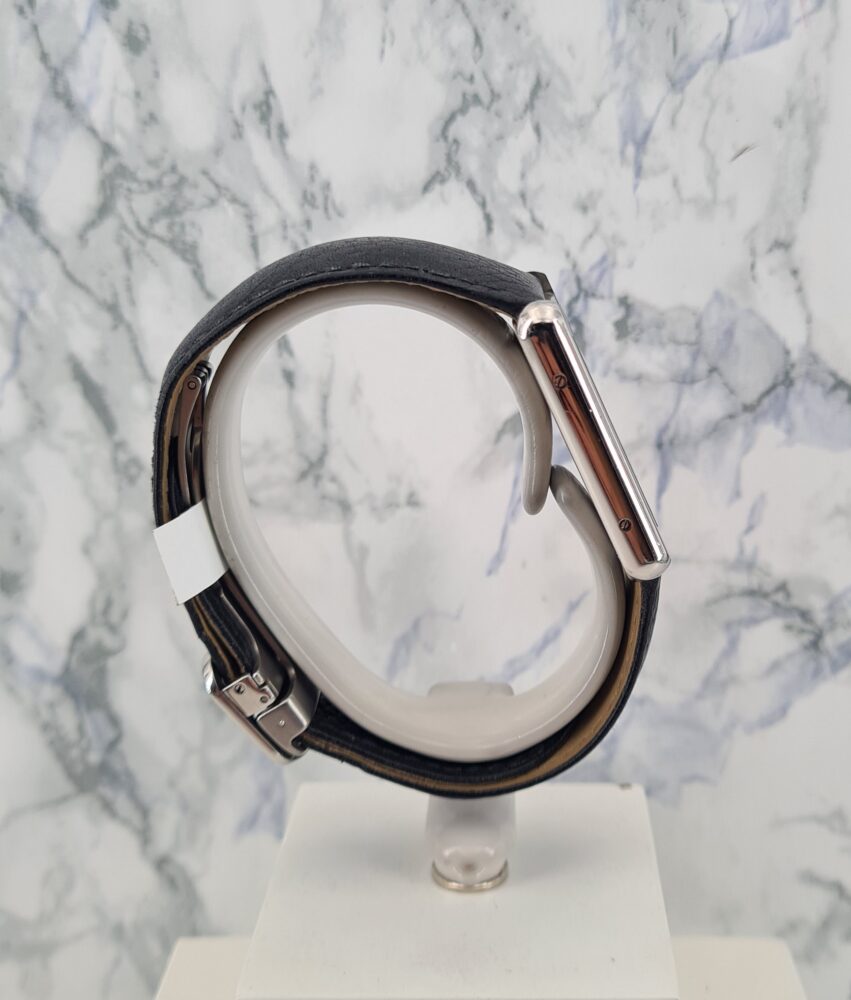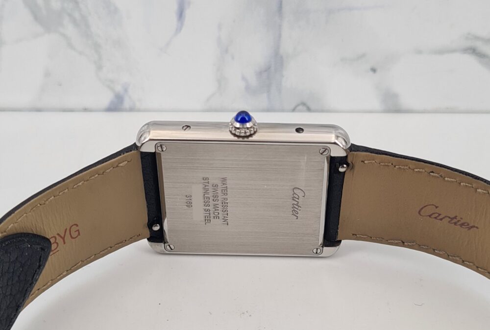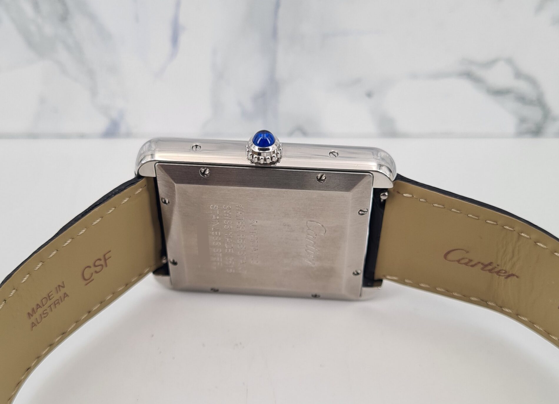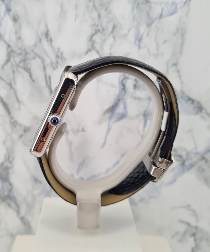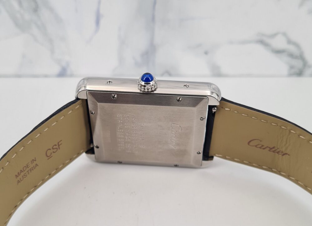 Avec ses attaches intégrées au boîtier, elle est tout à la fois un carré et un rectangle, coup de génie stylistique unique en son genre qui consiste à dissimuler les points d’attaches sous les célèbres brancards verticaux plats à arêtes vives de la montre Tank. La légende veut que Louis Cartier ait lui-même rapproché l’architecture de la montre Tank du dessin d’un char, vu de haut : les brancards pour les chenilles, le boîtier pour l’habitacle du véhicule.