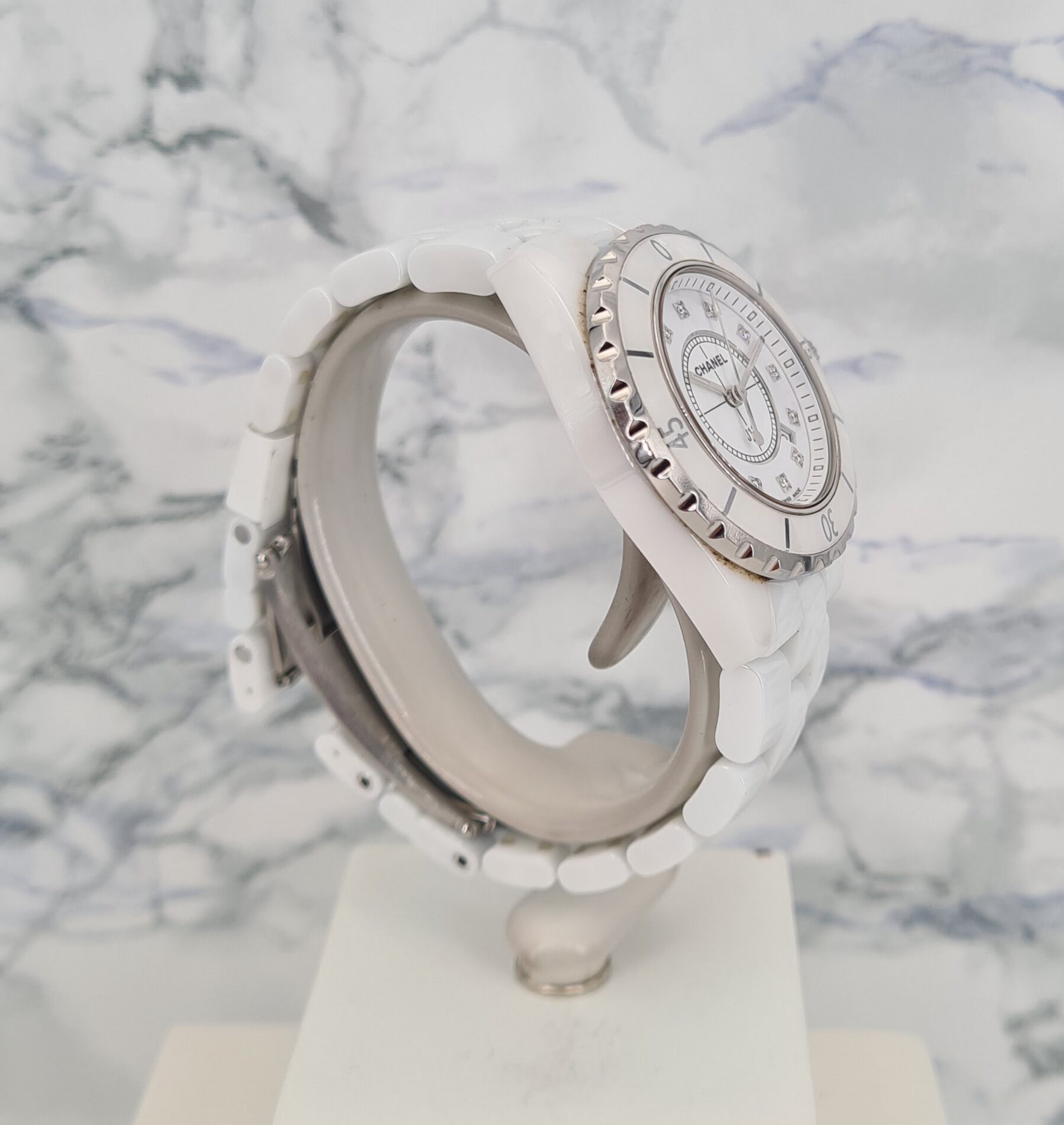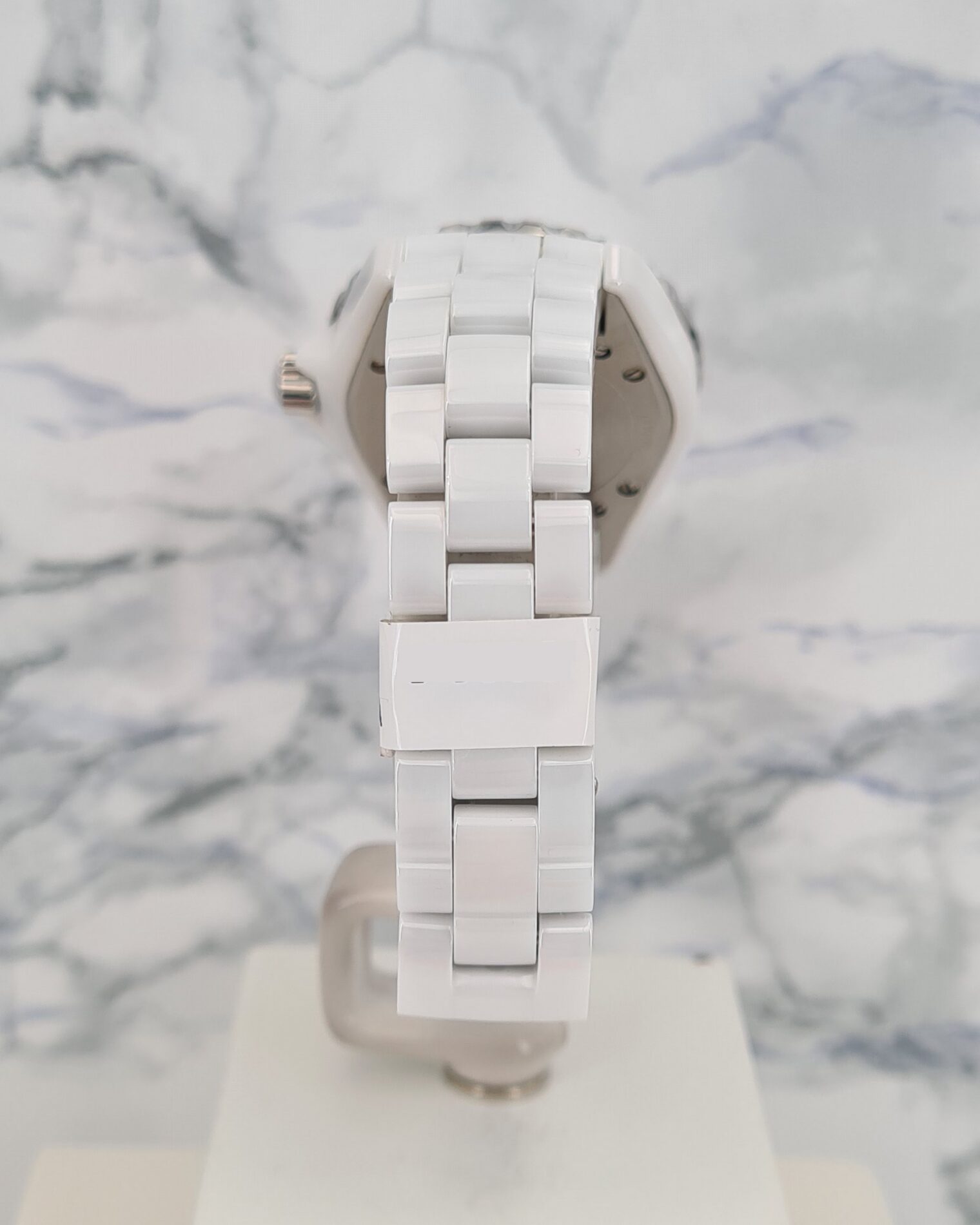 En l’an 2000 naissait le premier garde-temps sportif et unisexe de Chanel. Depuis, la montre J12 connaît un succès mondial, prorogeant sa séduction de nombreuses variations. Animé par un mouvement automatique, le tout premier modèle au boîtier de 33 mm de diamètre vêtu de céramique blanche, proposé sur un bracelet articulé dans le même sublime matériau, est donc naturellement devenu emblématique.