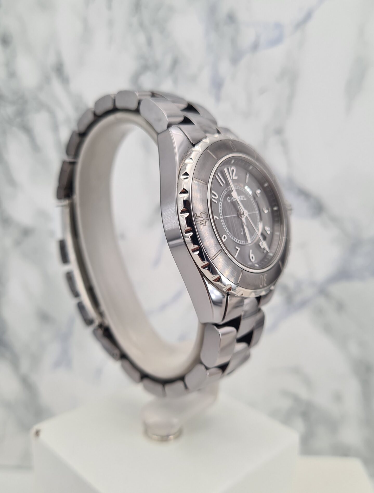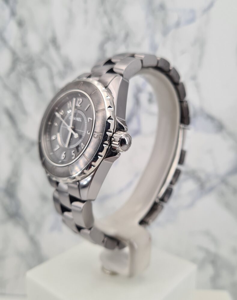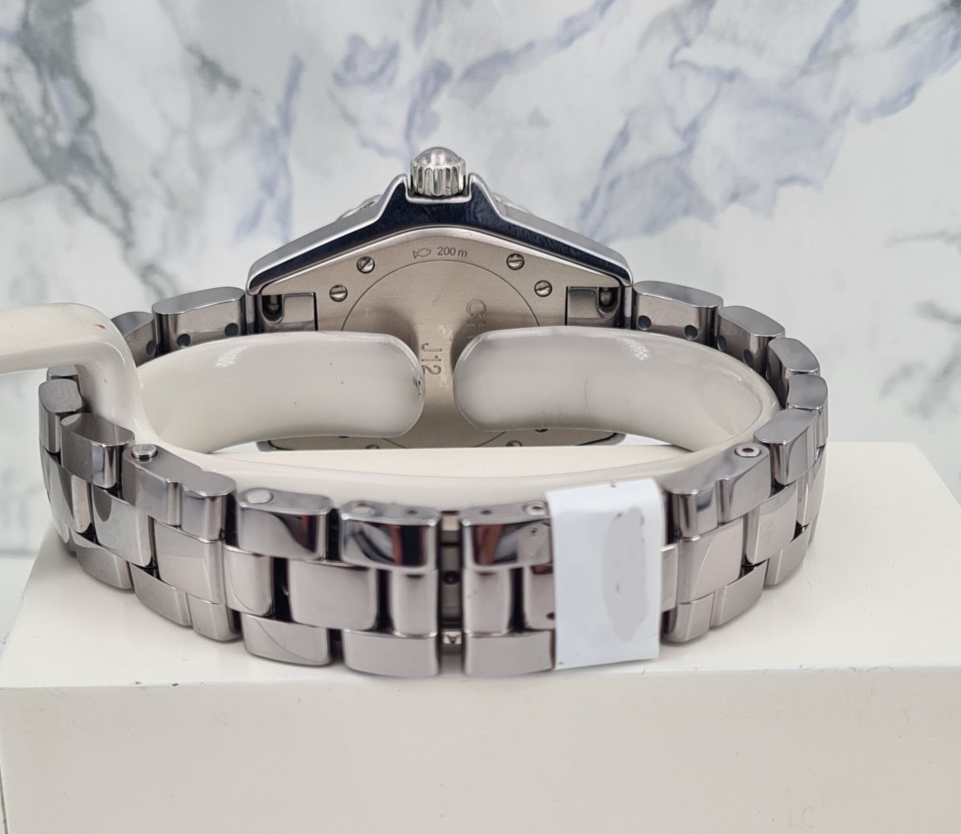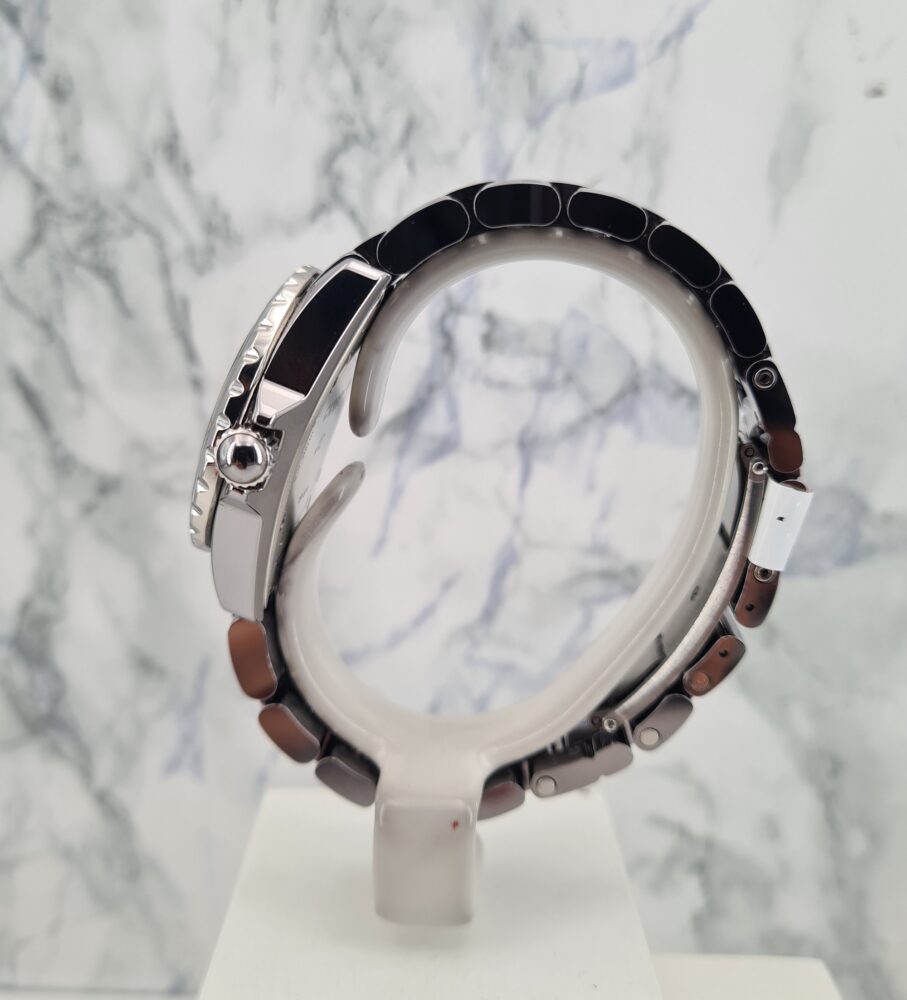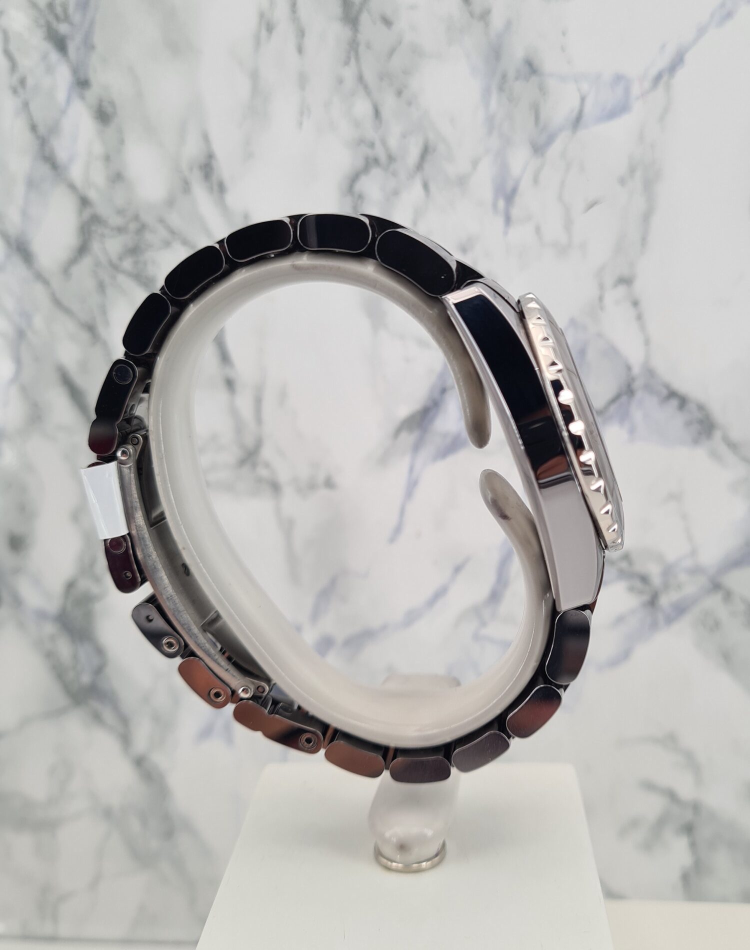 Modèle iconique de la marque Chanel, la J12 a révolutionné son temps en proposant une montre de luxe avec boitier et bracelet en céramique à haute résistance aux rayures ainsi que d’une étanchéité de 200m ce qui lui confère un ADN de plongeuse.
