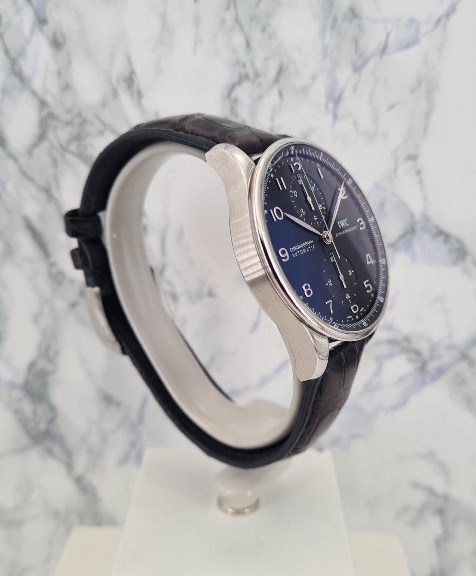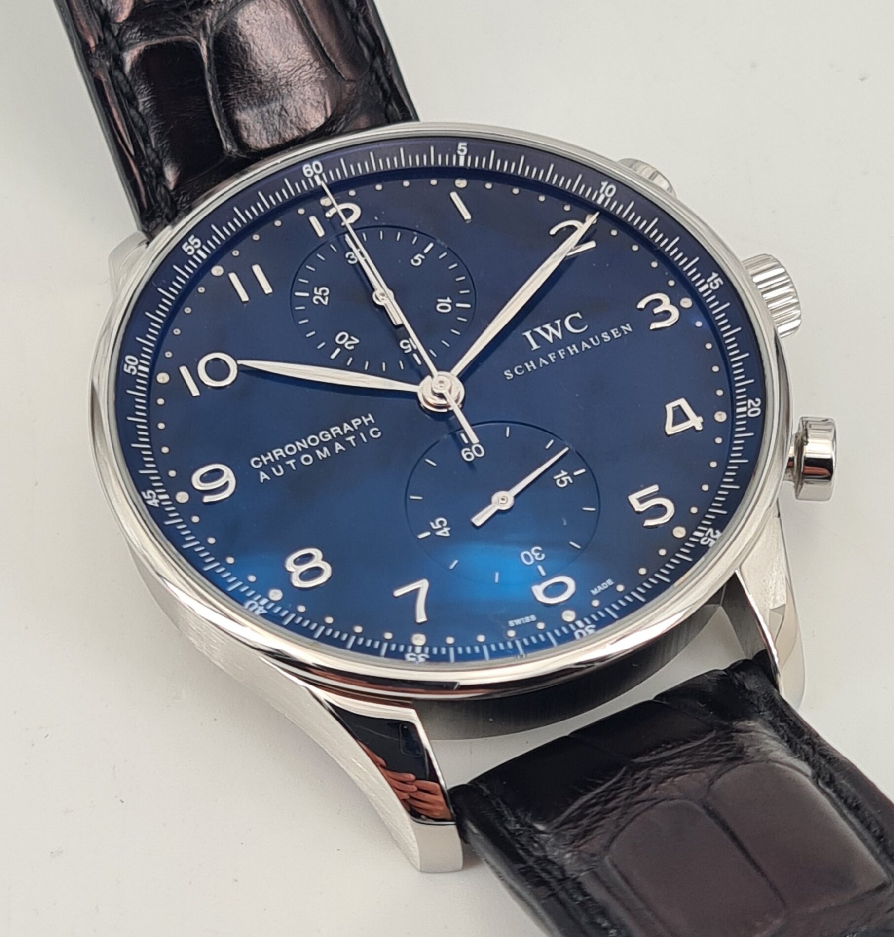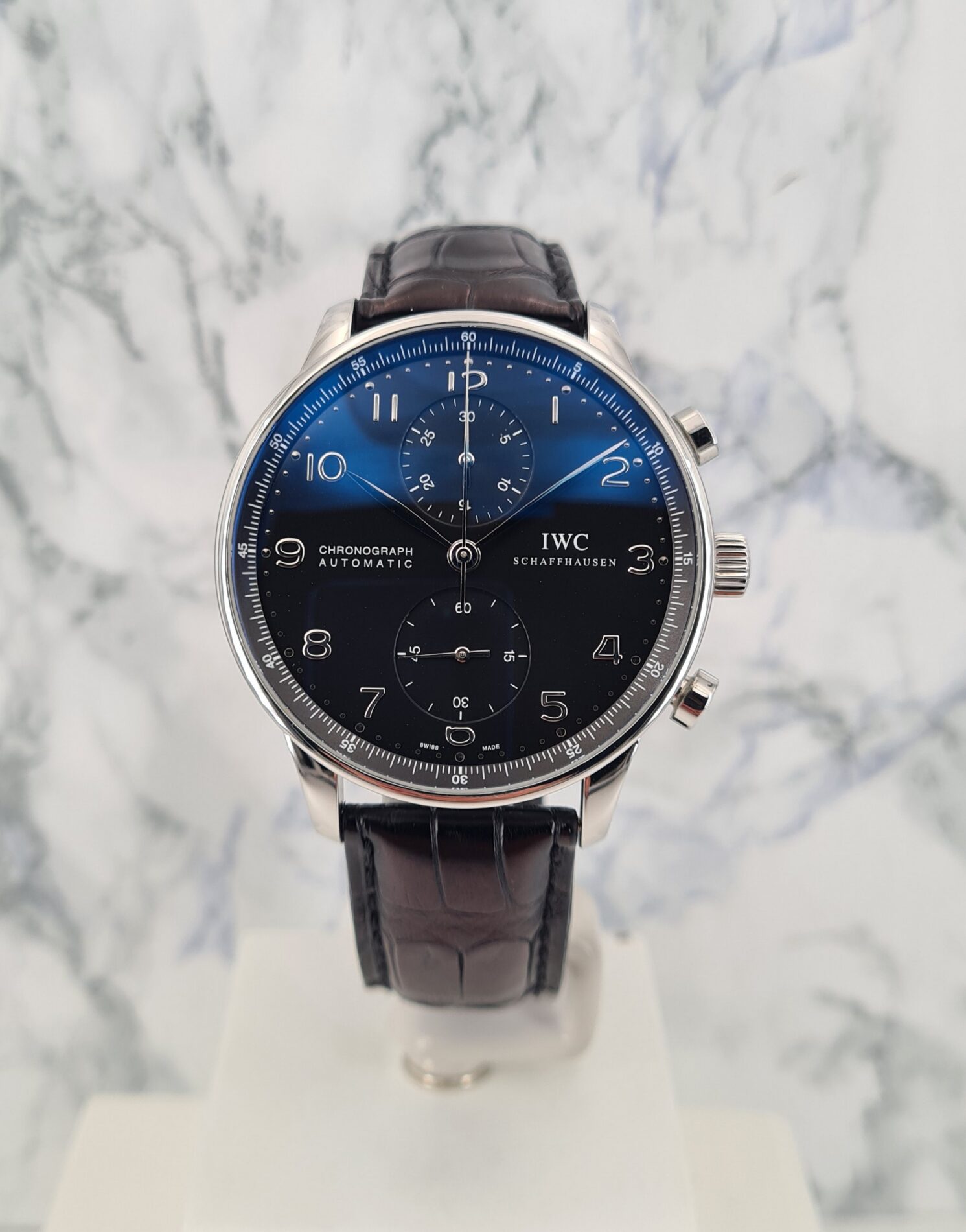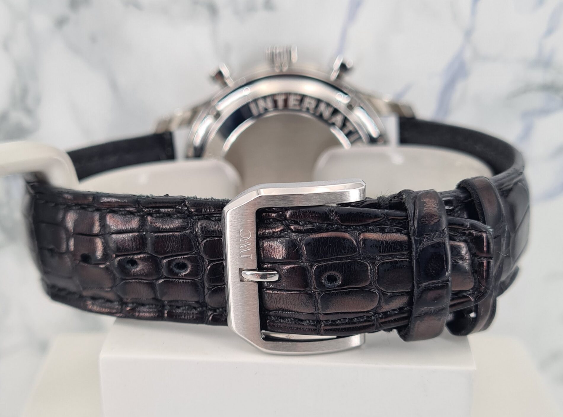 La Portuguese doit son sobriquet à deux hommes d’affaire portugais – Rodrigues et Teixeira – qui travaillaient dans l’industrie horlogère dans les années 30. Ils se rendirent au siège d’IWC à Schaffausen avec une demande un peu particulière : faire produire une montre-bracelet de grande taille, en acier, équipée d’un mouvement aussi précis qu’un chronomètre de marine, la référence de l’époque.