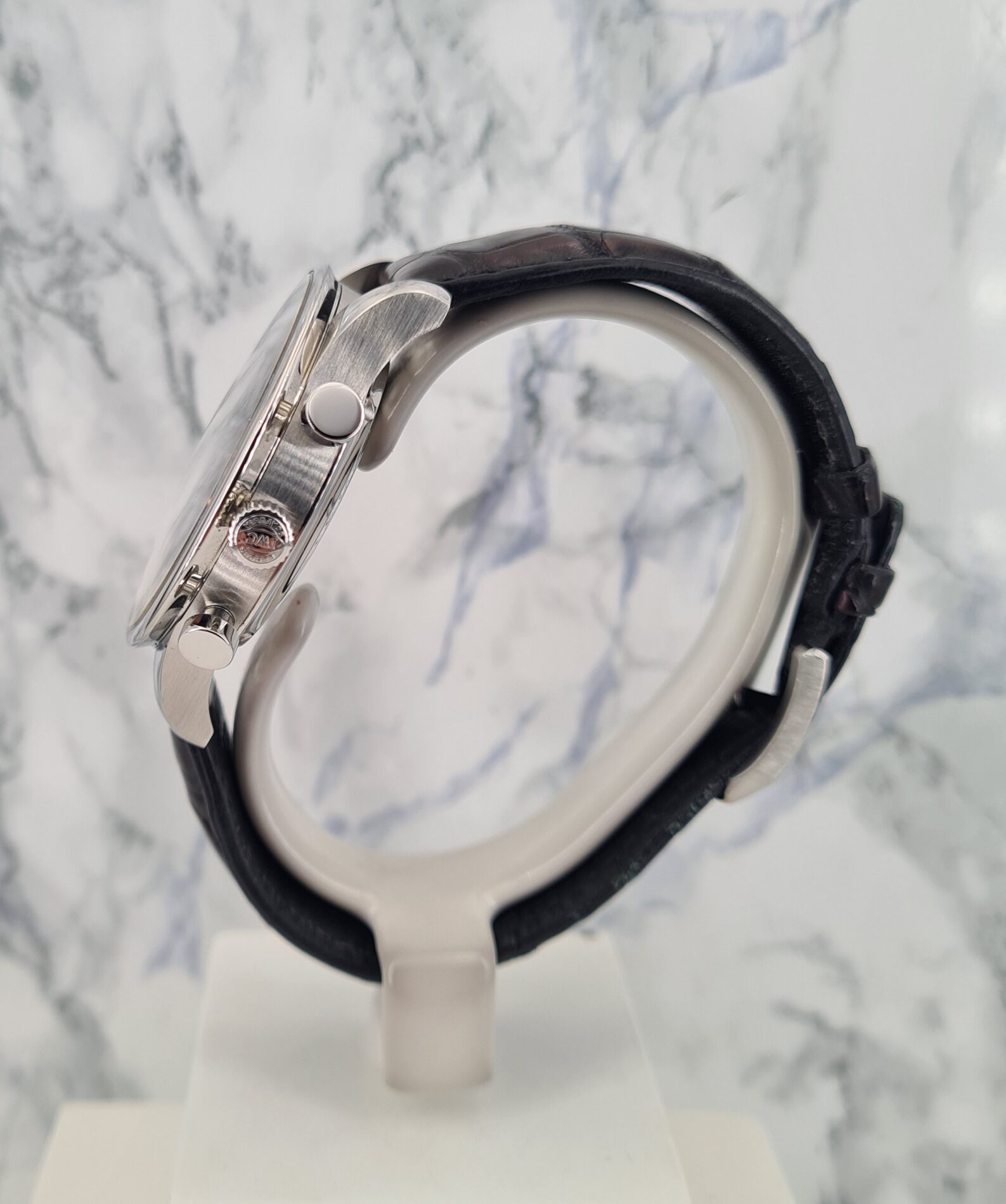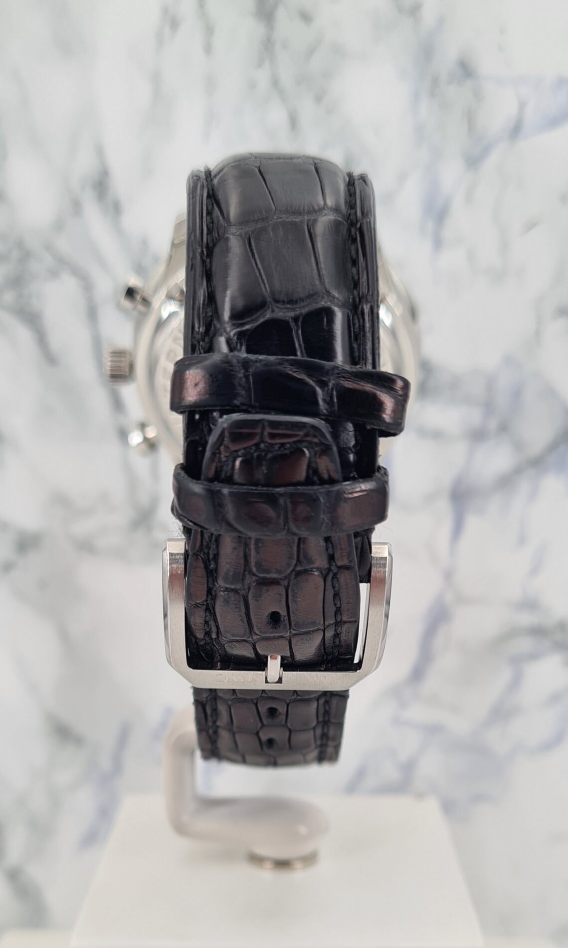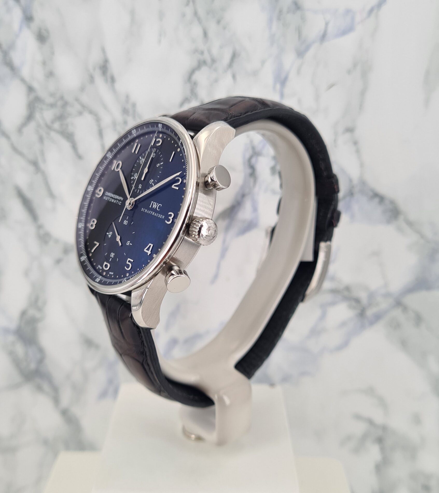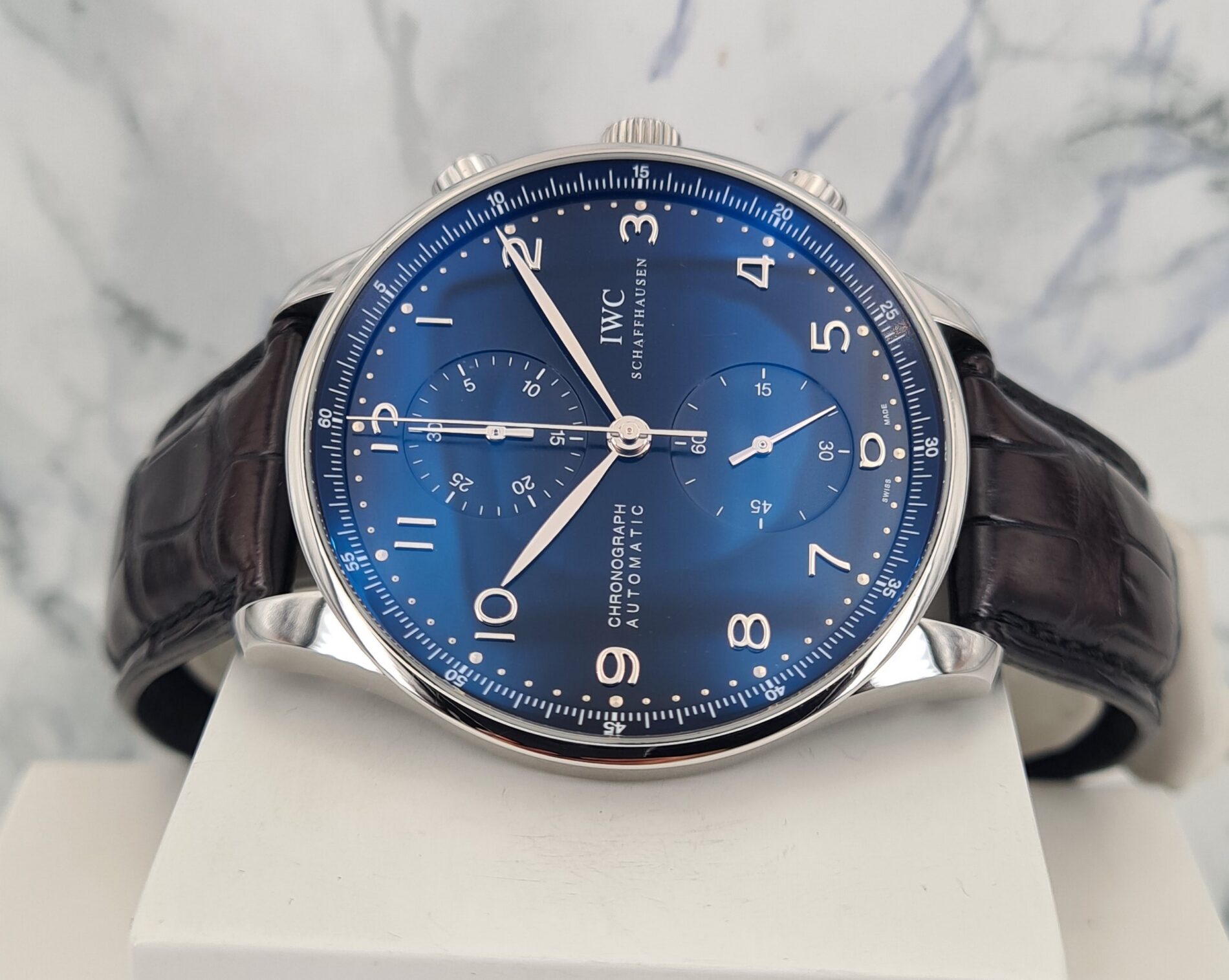 La Portuguese doit son sobriquet à deux hommes d’affaire portugais – Rodrigues et Teixeira – qui travaillaient dans l’industrie horlogère dans les années 30. Ils se rendirent au siège d’IWC à Schaffausen avec une demande un peu particulière : faire produire une montre-bracelet de grande taille, en acier, équipée d’un mouvement aussi précis qu’un chronomètre de marine, la référence de l’époque.