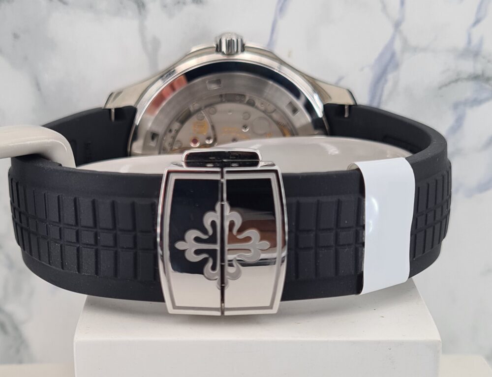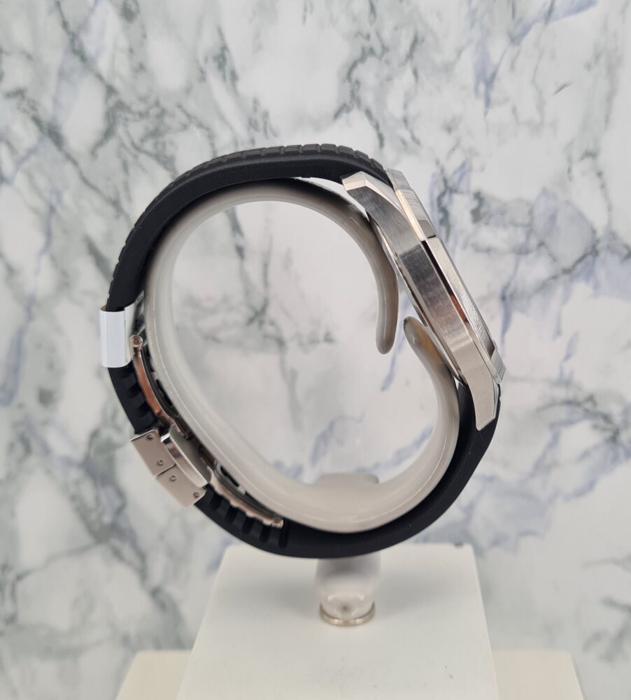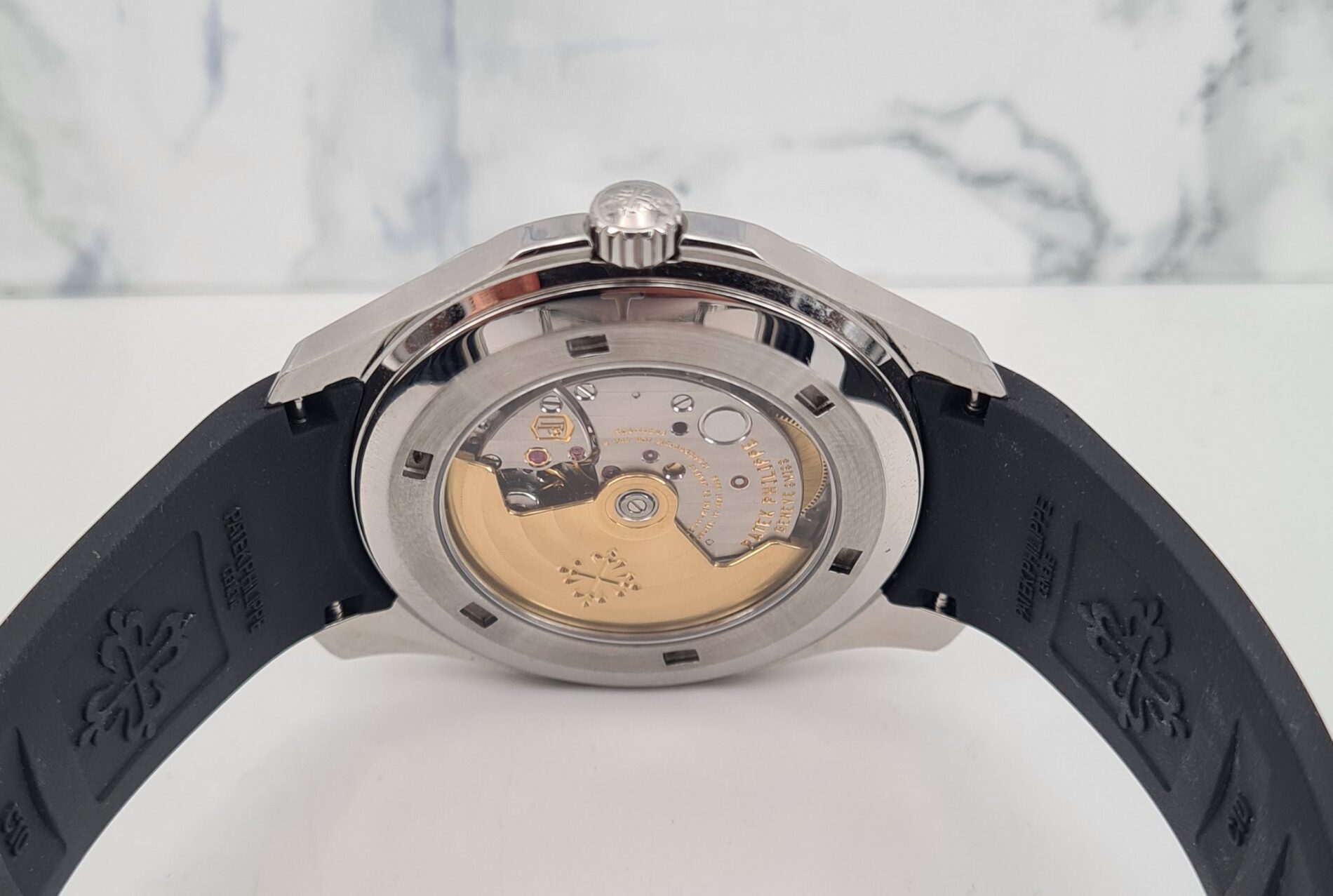 Quintessence du style Aquanaut, ce modèle en acier se distingue par son cadran au relief frappé noir et son bracelet en matière composite assortie. Les volumes originaux du boîtier et de la lunette sont soulignés par l’alternance de finitions polies et satinées. Le temps est rythmé par un mouvement automatique visible à travers le fond saphir transparent.