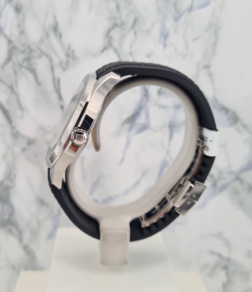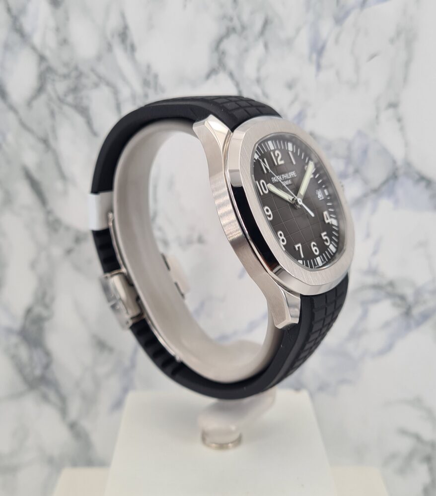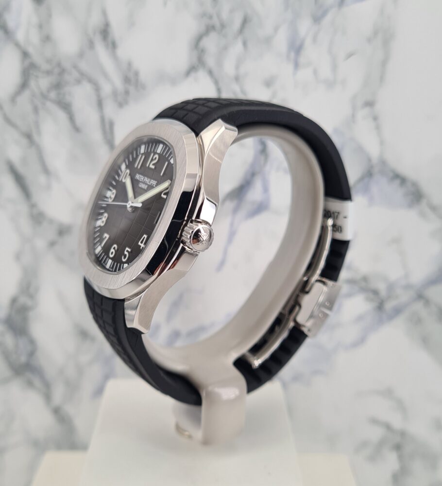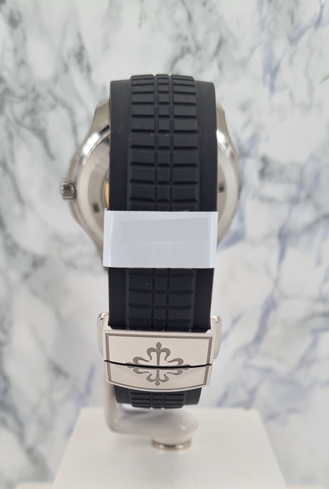 Quintessence du style Aquanaut, ce modèle en acier se distingue par son cadran au relief frappé noir et son bracelet en matière composite assortie. Les volumes originaux du boîtier et de la lunette sont soulignés par l’alternance de finitions polies et satinées. Le temps est rythmé par un mouvement automatique visible à travers le fond saphir transparent.