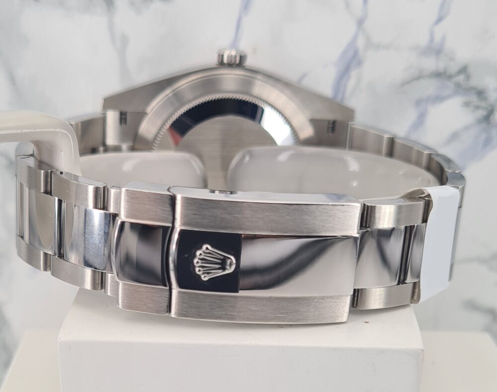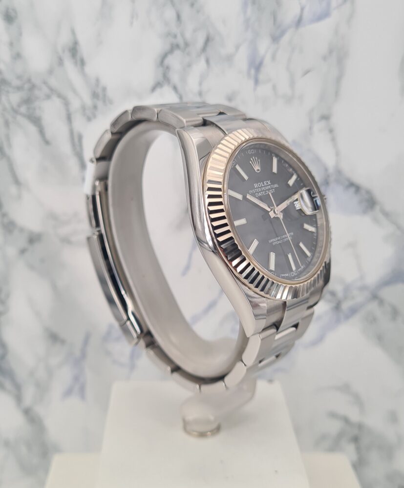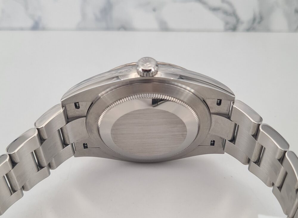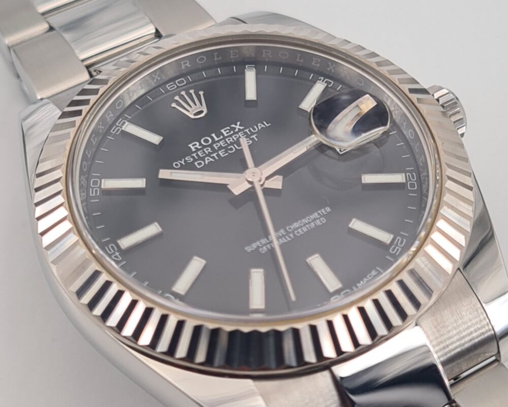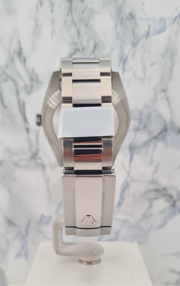 La Datejust 41 perpétue bien évidemment la tradition de la Datejust, modèle emblématique de Rolex créé en 1945 et première montre-bracelet Chronomètre, automatique et étanche à afficher la date dans un guichet sur le cadran.Le boîtier Oyster de 41 mm de la Datejust 41, garanti étanche jusqu’à 100 mètres, est un exemple de robustesse. Sa carrure aux formes caractéristiques est taillée dans un bloc massif d’acier 904L particulièrement résistant à la corrosion. Le fond cannelé est hermétiquement vissé à l’aide d’un outil spécial propre aux horlogers Rolex.