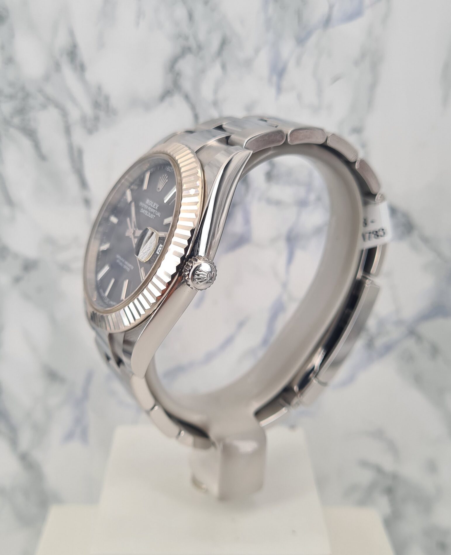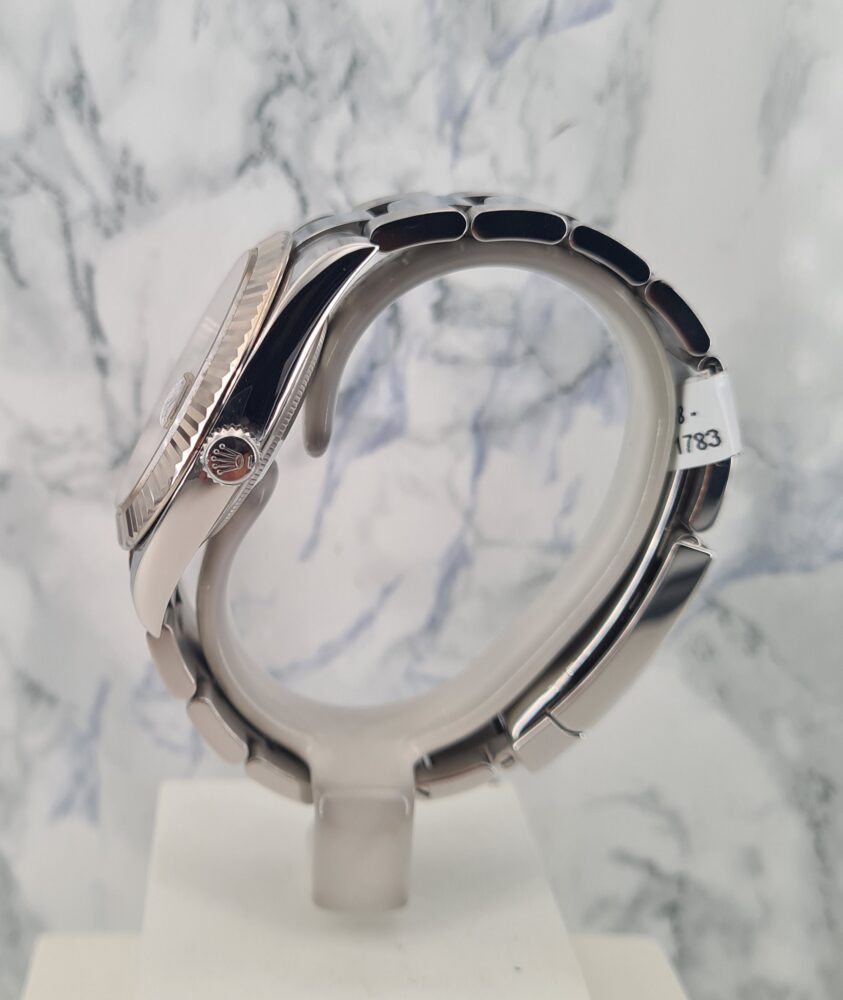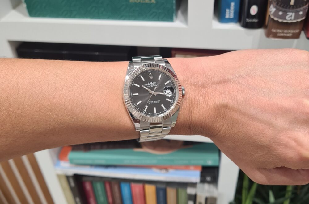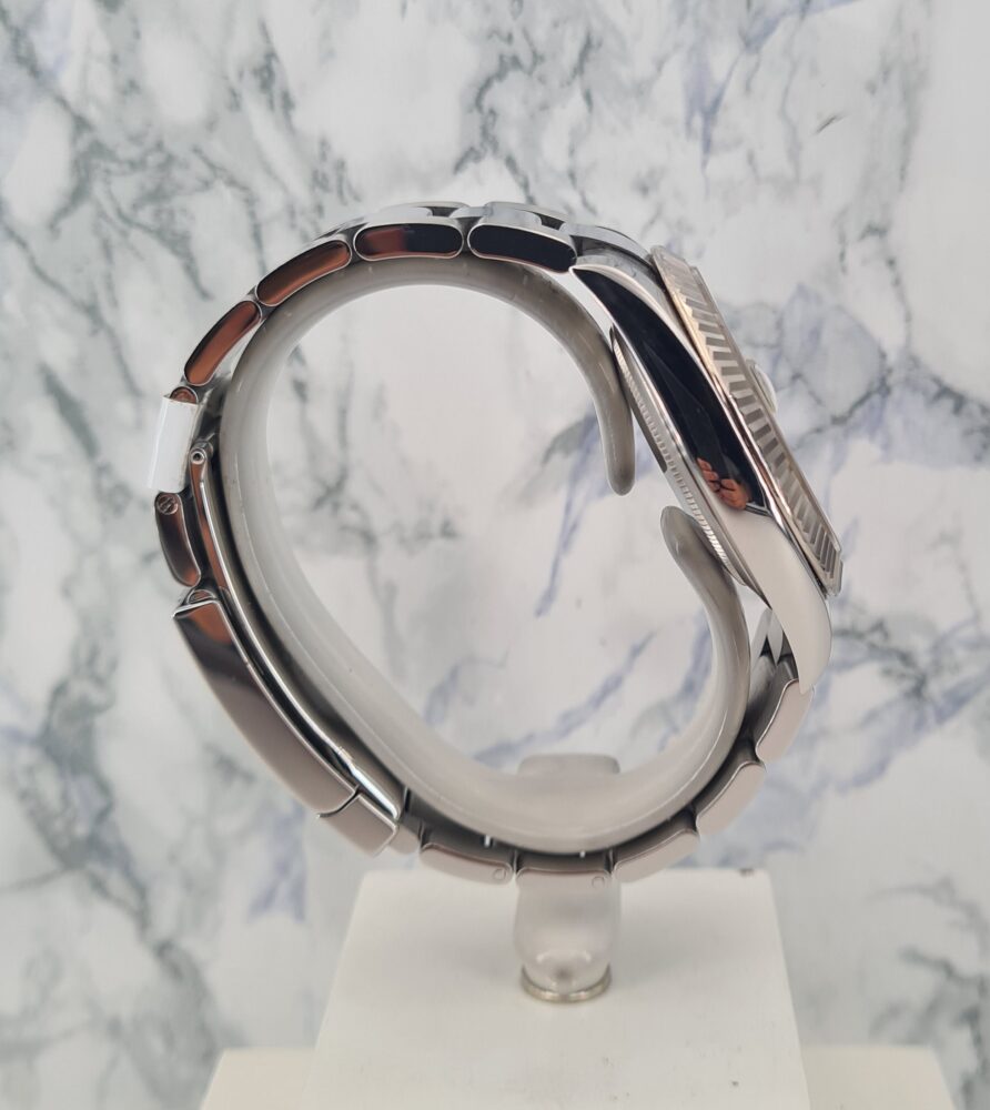 La Datejust 41 perpétue bien évidemment la tradition de la Datejust, modèle emblématique de Rolex créé en 1945 et première montre-bracelet Chronomètre, automatique et étanche à afficher la date dans un guichet sur le cadran.Le boîtier Oyster de 41 mm de la Datejust 41, garanti étanche jusqu’à 100 mètres, est un exemple de robustesse. Sa carrure aux formes caractéristiques est taillée dans un bloc massif d’acier 904L particulièrement résistant à la corrosion. Le fond cannelé est hermétiquement vissé à l’aide d’un outil spécial propre aux horlogers Rolex.