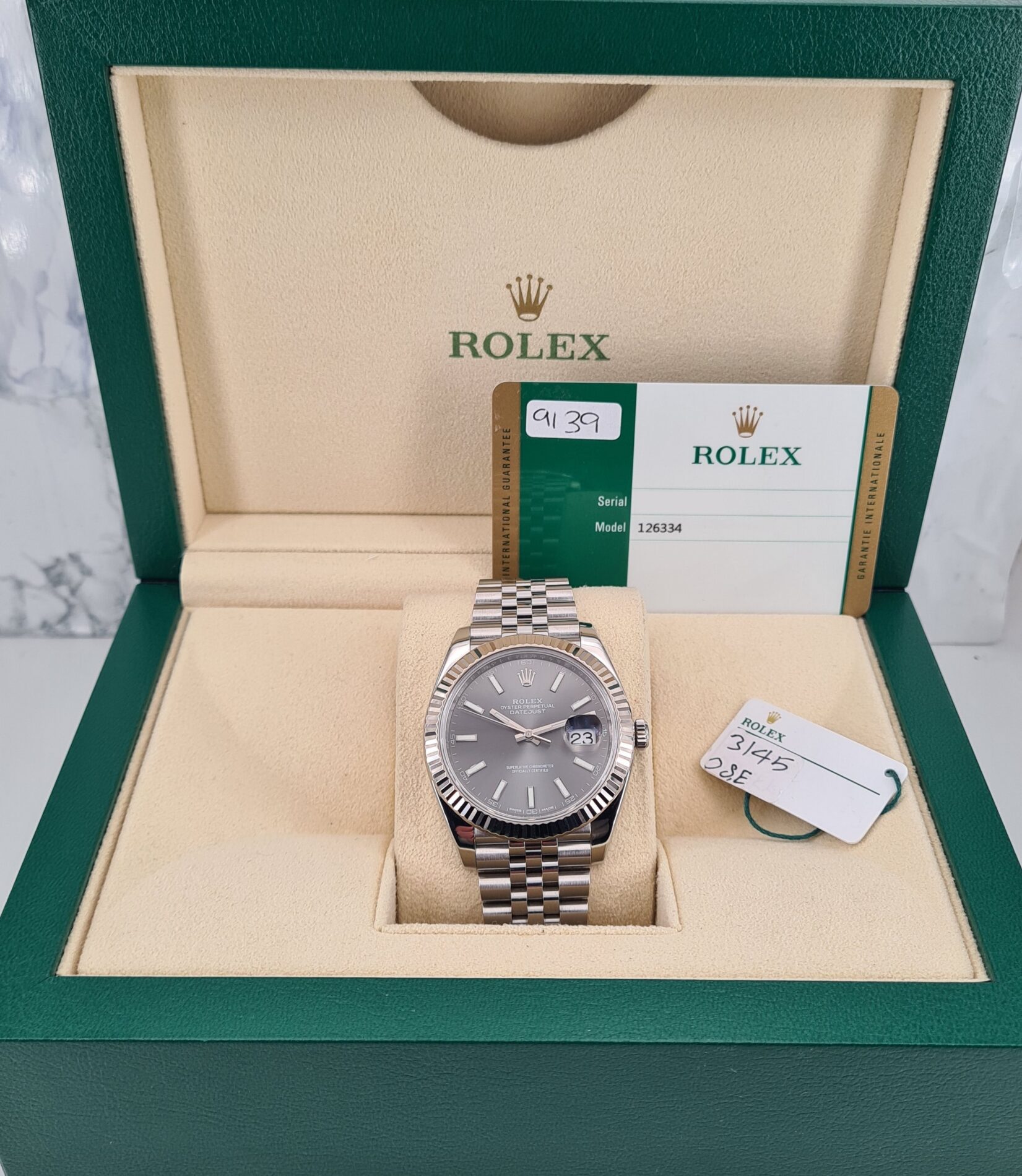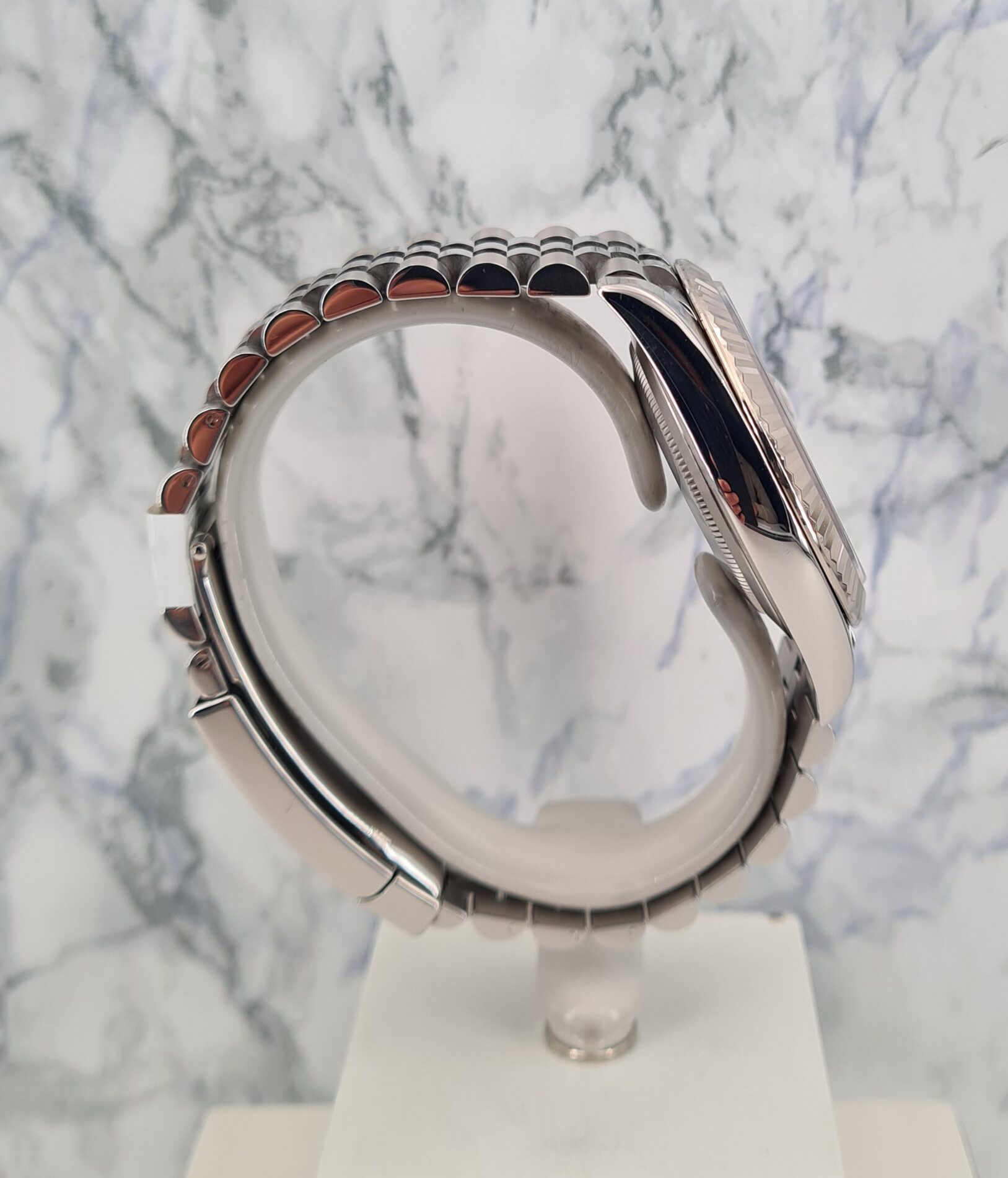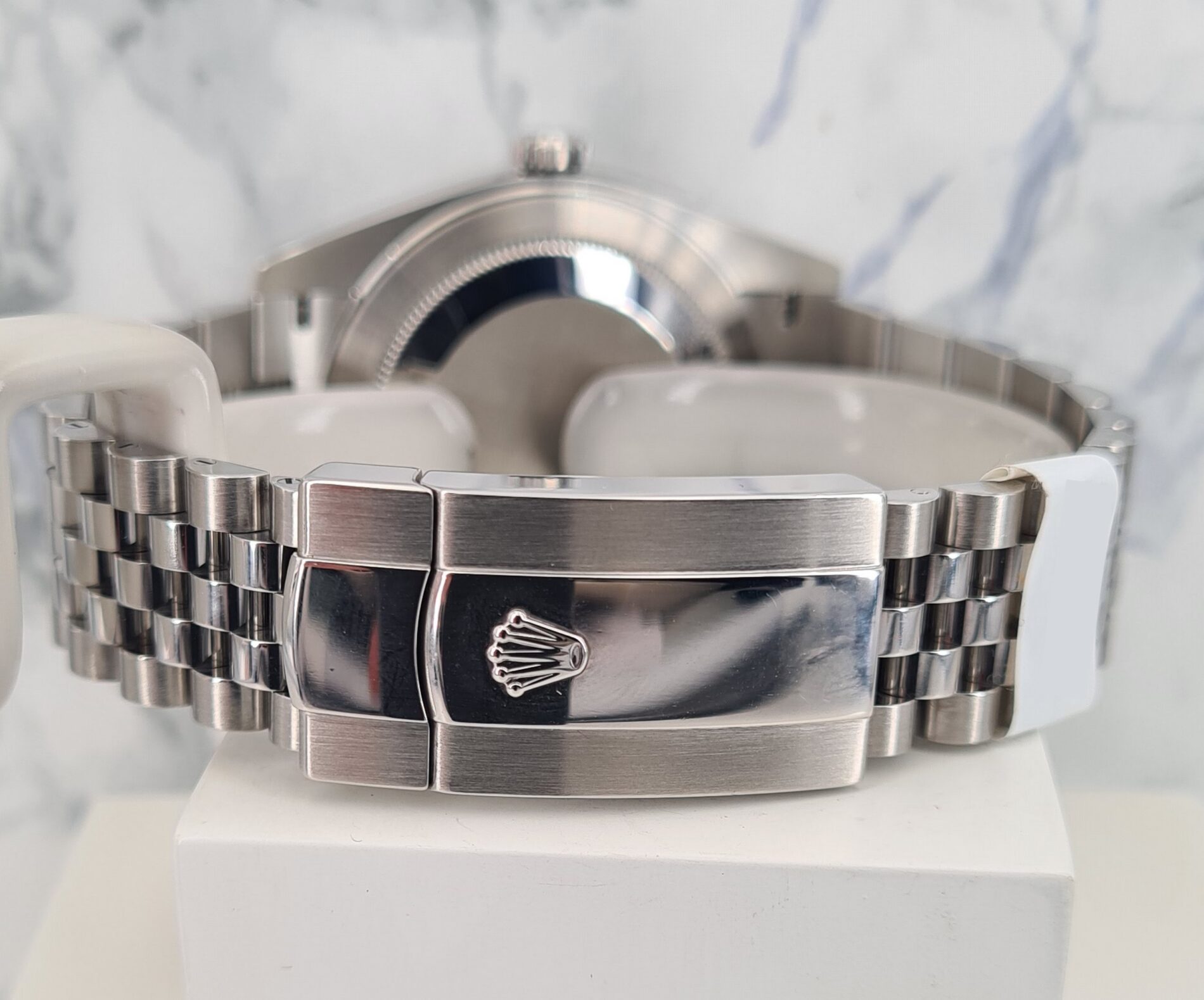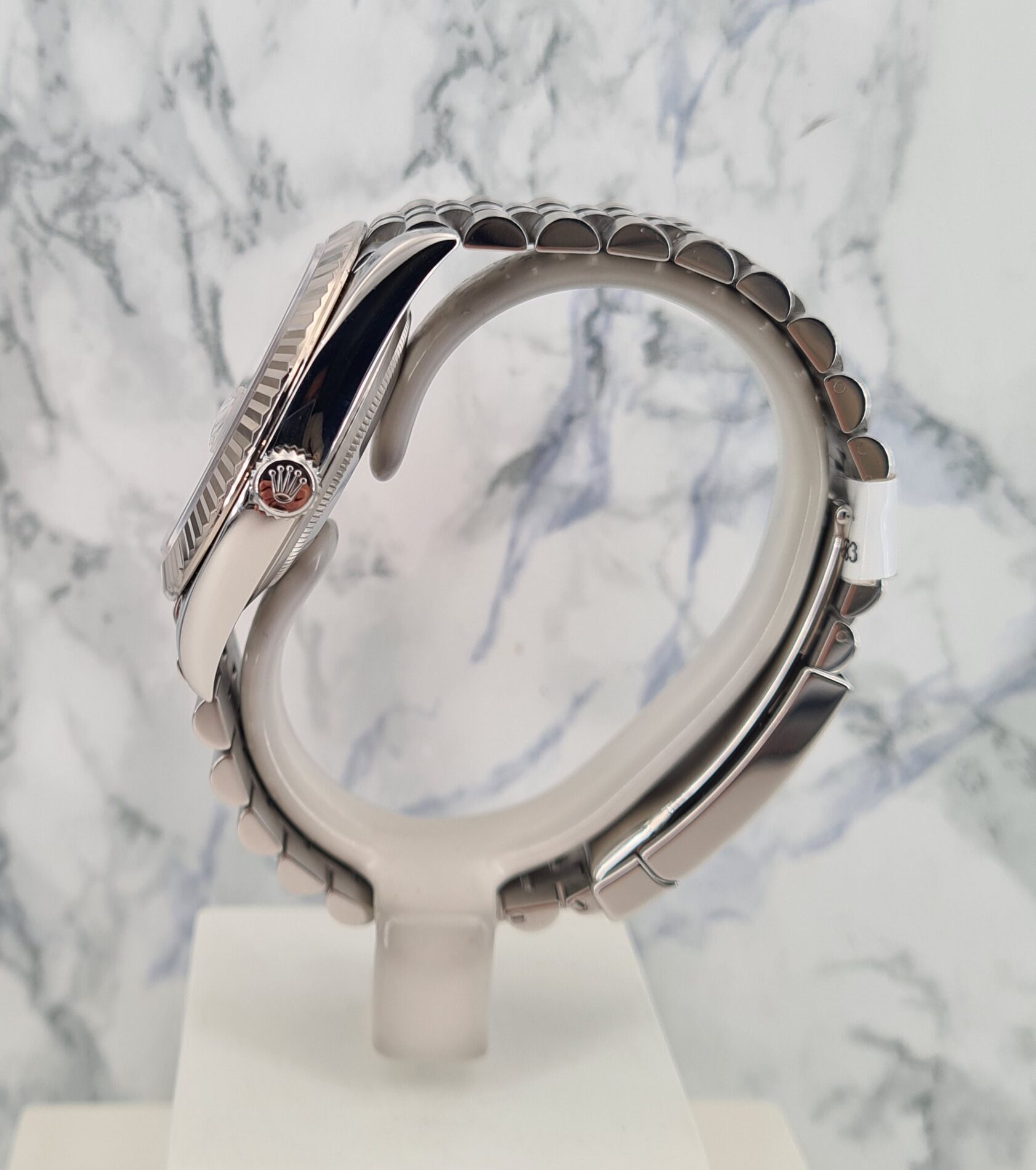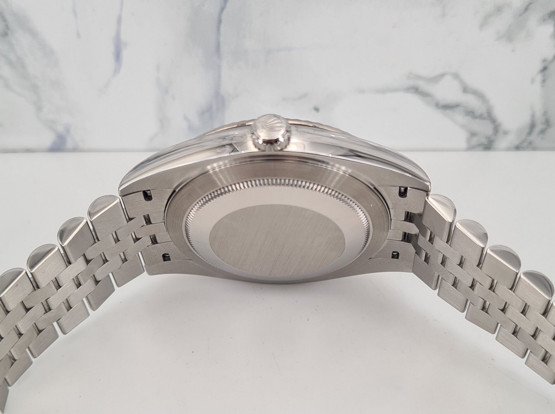 La Datejust 41 perpétue bien évidemment la tradition de la Datejust, modèle emblématique de Rolex créé en 1945 et première montre-bracelet Chronomètre, automatique et étanche à afficher la date dans un guichet sur le cadran.Le boîtier Oyster de 41 mm de la Datejust 41, garanti étanche jusqu’à 100 mètres, est un exemple de robustesse. Sa carrure aux formes caractéristiques est taillée dans un bloc massif d’acier 904L particulièrement résistant à la corrosion. Le fond cannelé est hermétiquement vissé à l’aide d’un outil spécial propre aux horlogers Rolex.
