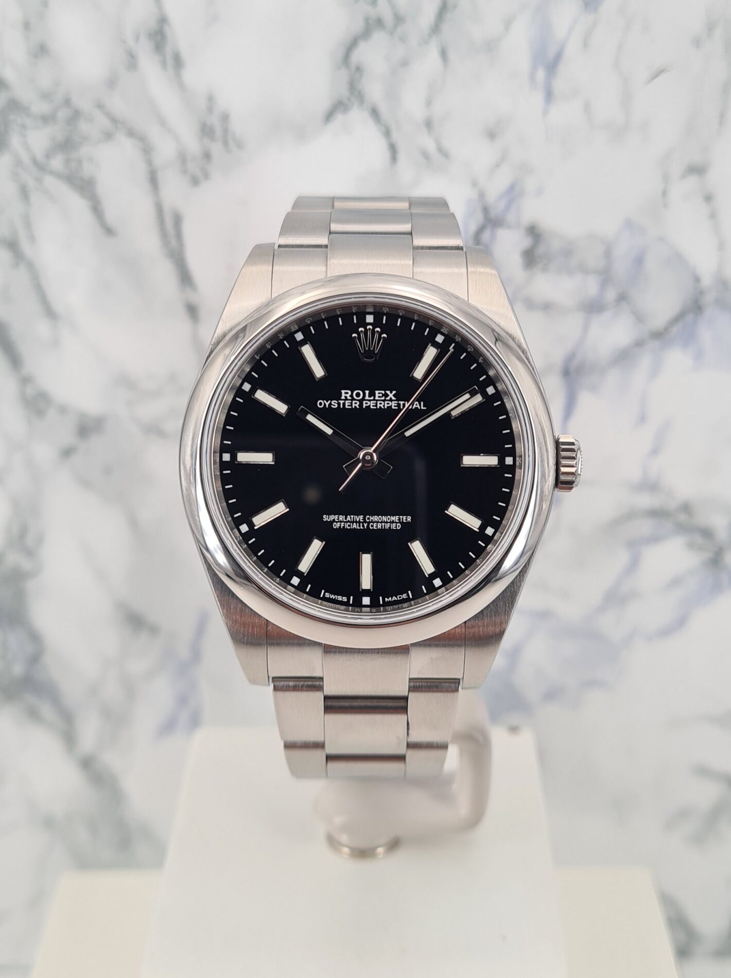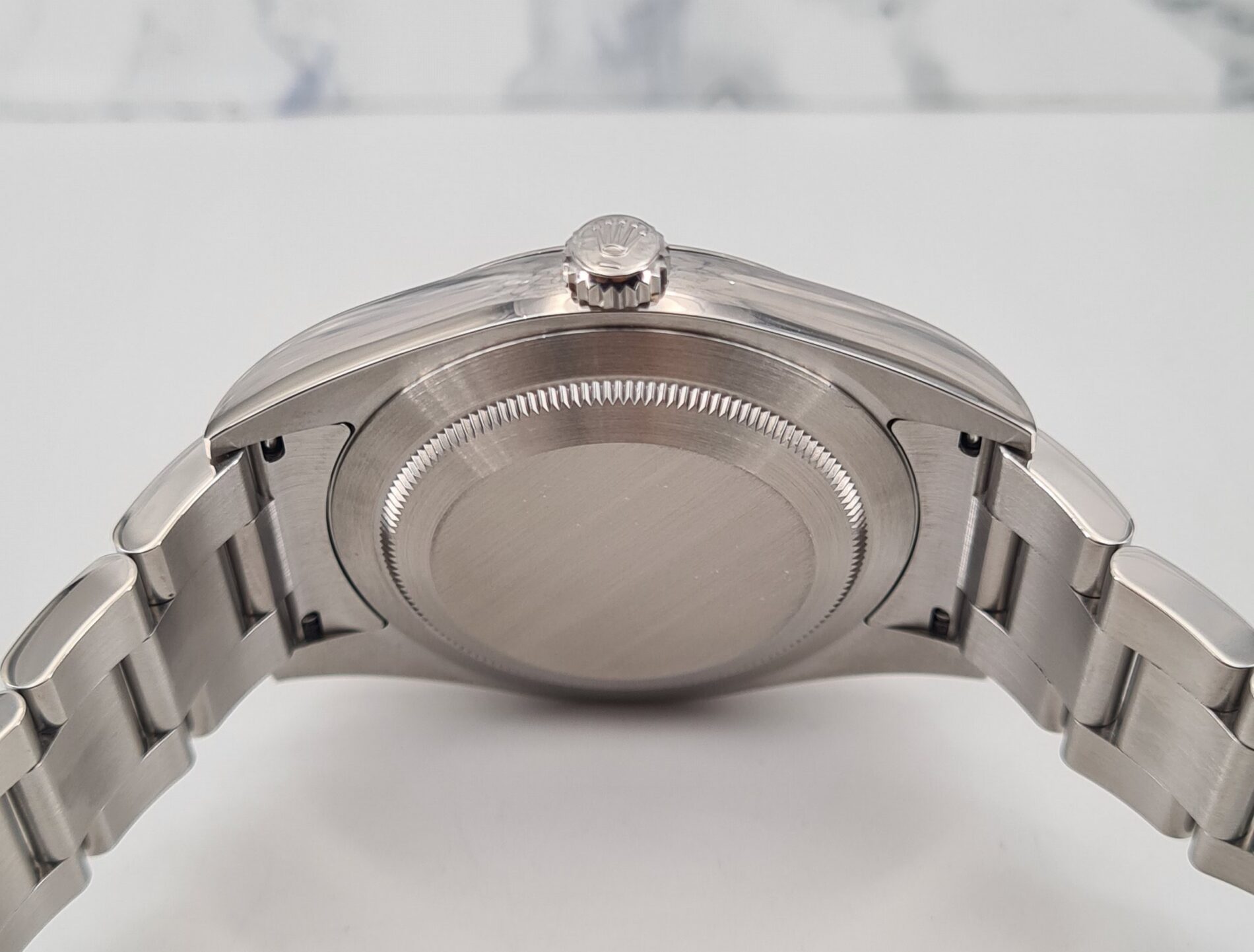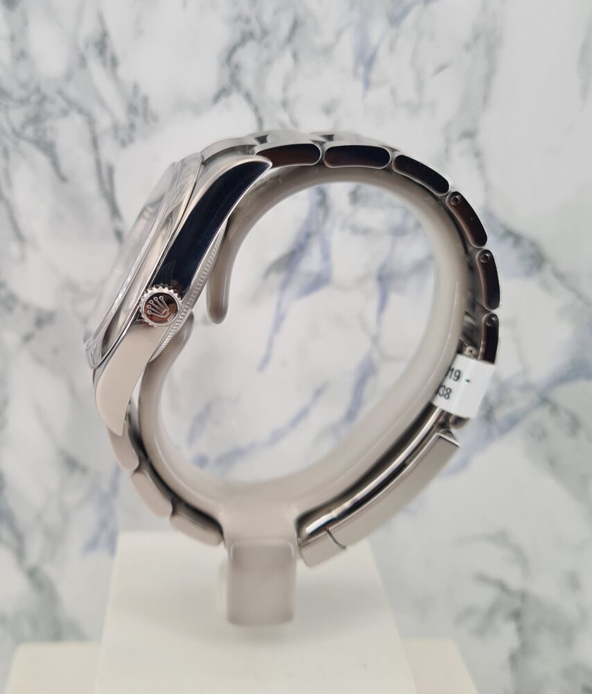 Lancée en 2018, cette Oyster Perpetual de 39 mm possède un cadran blanc étoilé très apprécié, en plus des versions bleue, grise et noire.