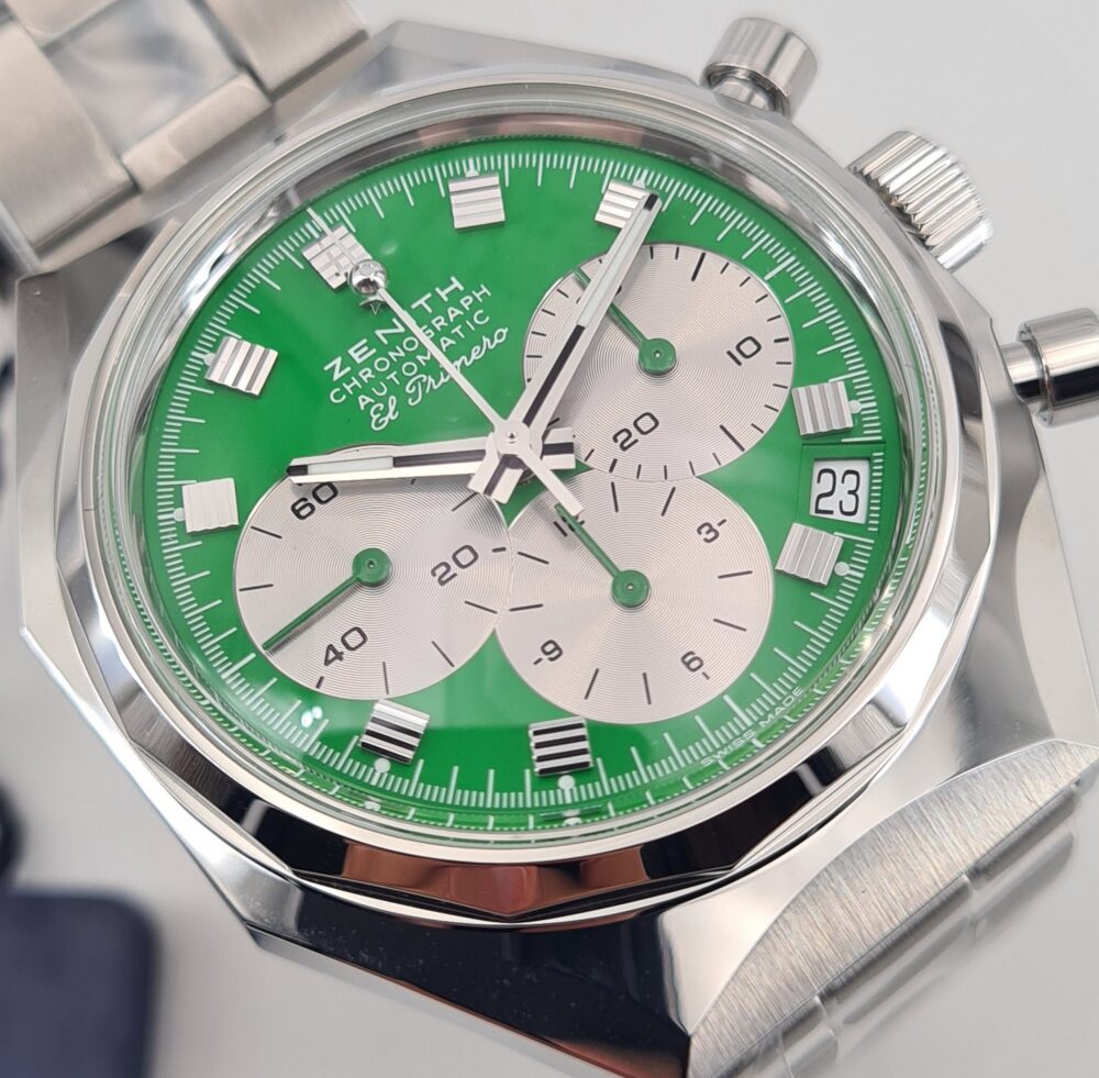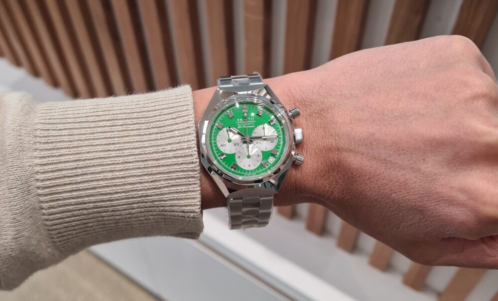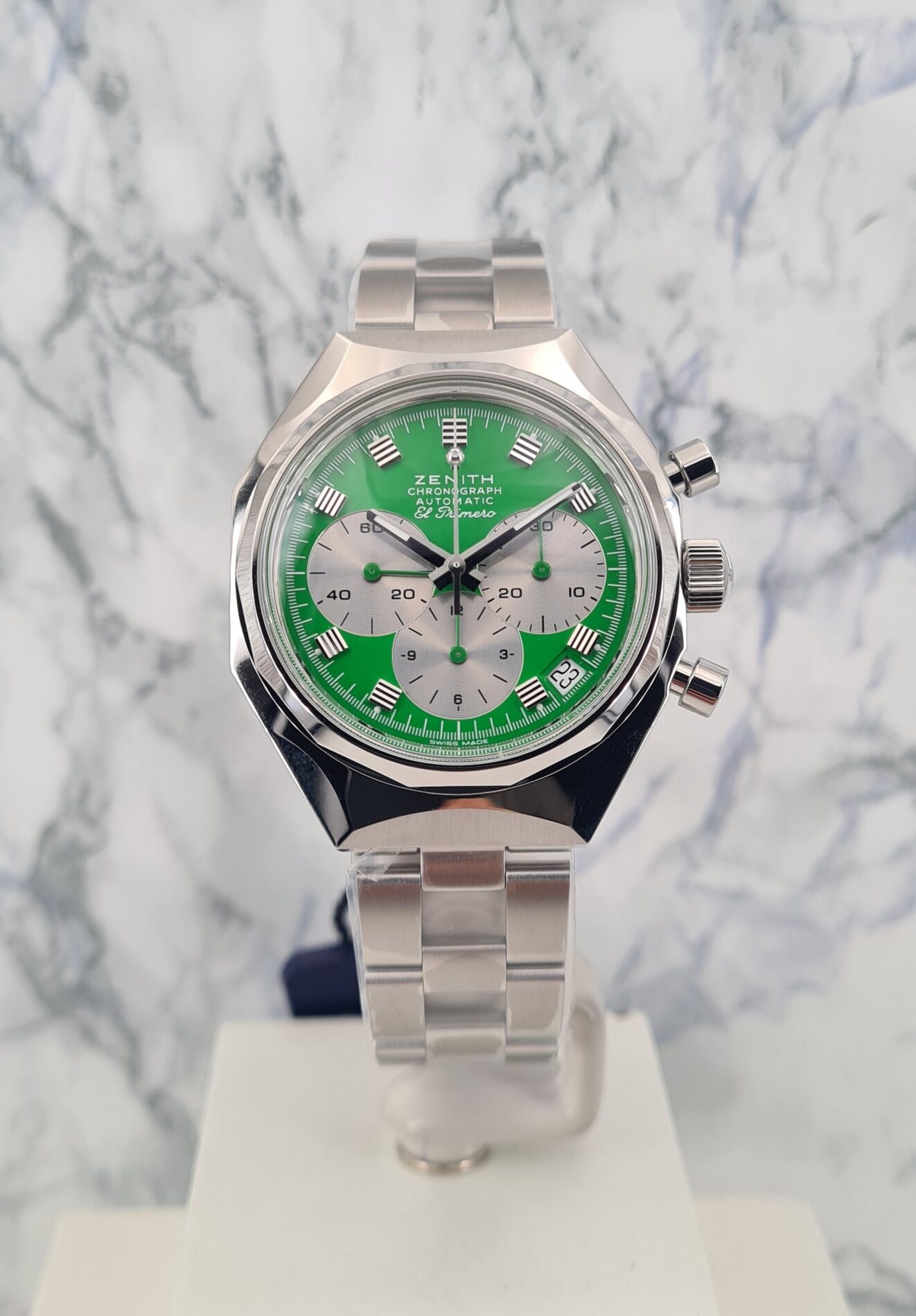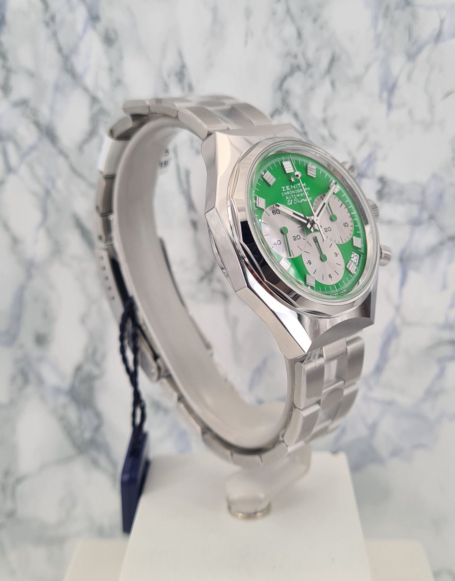Produite à seulement soixante exemplaires, la DEFY Chronograph USM Green se distingue avant tout par sa rareté. Elle est le fruit d’une collaboration exclusive entre deux maisons suisses emblématiques, Zenith et USM, qui partagent la même vision d’un design fonctionnel, précis et intemporel. C’est également la première fois que le mythique calibre El Primero trouve place dans le boîtier Defy Revival, donnant naissance à une montre inédite qui s’inscrit pourtant naturellement dans l’héritage de la Maison. Son esthétique singulière conjugue la robustesse du boîtier octogonal de 37 mm et de la lunette à quatorze pans avec la finesse rétro des poussoirs “pompe” et du bracelet ladder Gay Frères. Chaque détail raconte une histoire, comme l’aiguille du chronographe terminée par une sphère USM luminescente, symbole discret de la rencontre entre horlogerie et design industriel. Enfin, la pièce est livrée dans un coffret exclusif USM Haller, véritable meuble modulaire fonctionnel, prolongeant ainsi l’expérience bien au-delà de la montre elle-même.